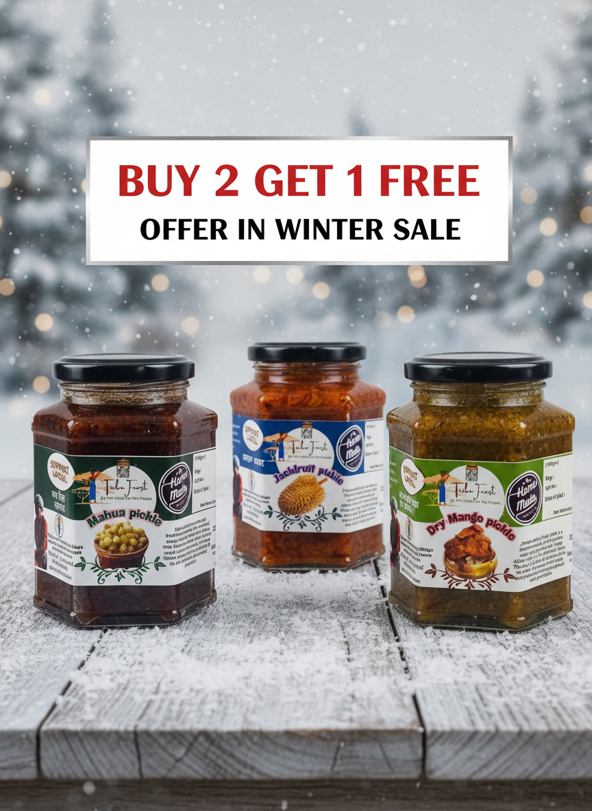 TribeFeast Pickle brings you the authentic taste of Jharkhand, made with love and care by village women using traditional home-made processes. Each jar is filled with rich flavors and handcrafted perfection — from hand-picked raw ingredients sourced directly from local villages. Every bite carries the warmth of Jharkhand’s culture, the purity of village life, and the tangy, spicy goodness of home-style pickling.